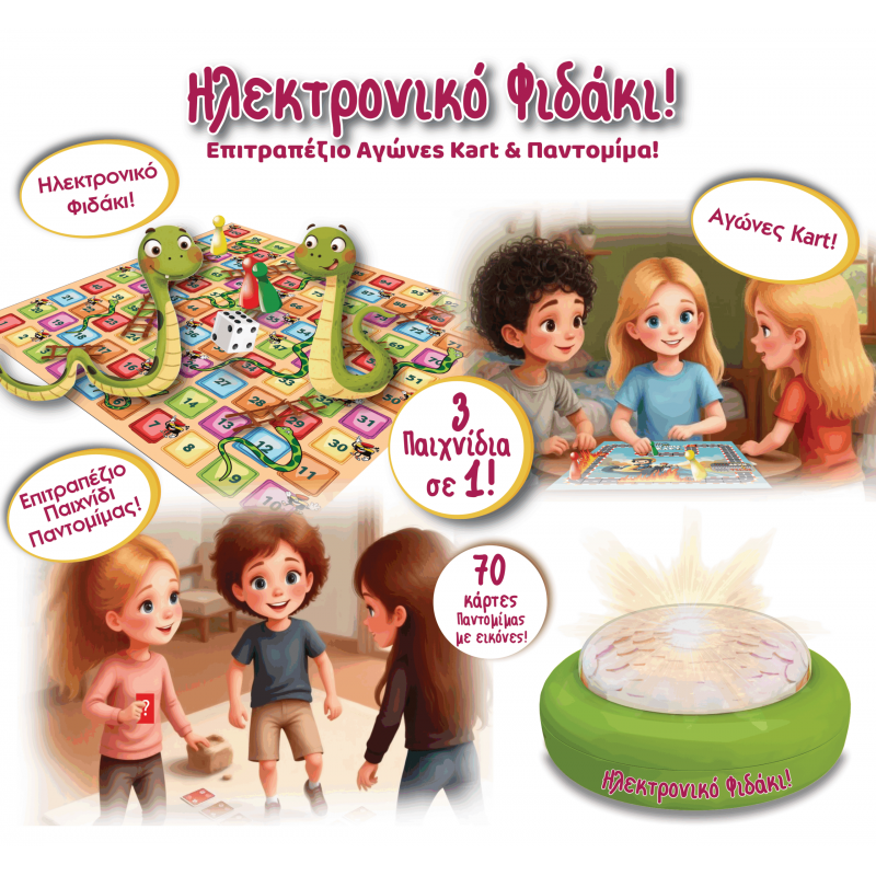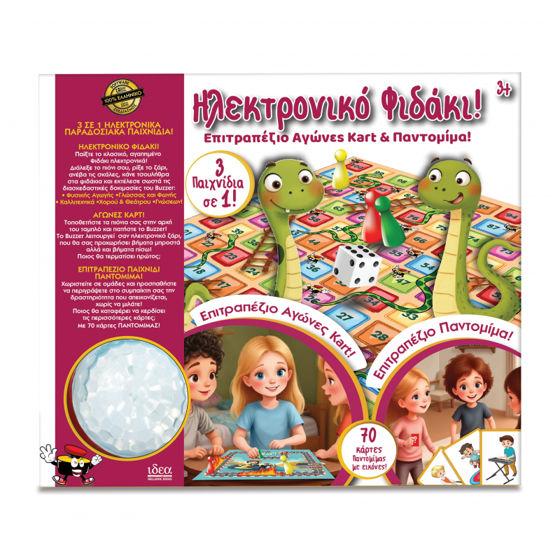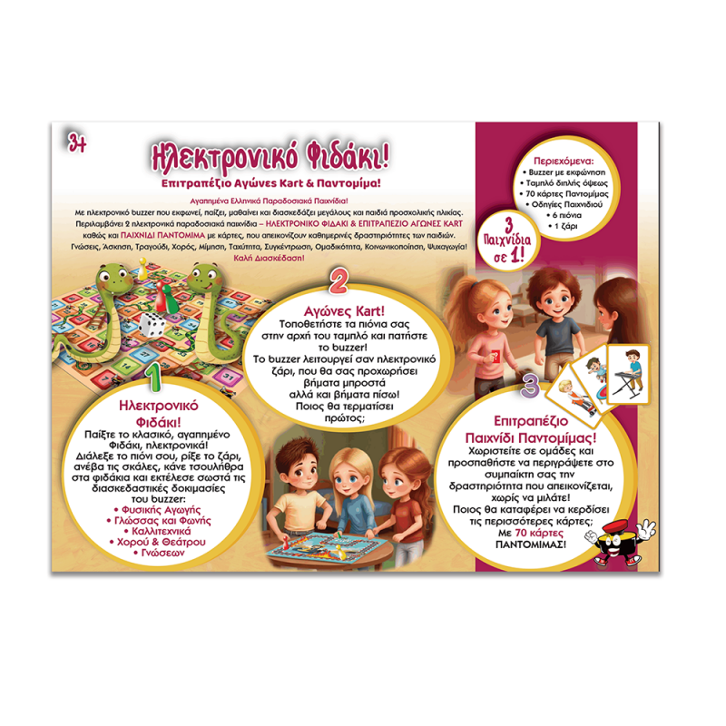 Περιλαμβάνει 2 ηλεκτρονικά παραδοσιακά παιχνίδια – ΗΛΕΚΤΡΟΝΙΚΟ ΦΙΔΑΚΙ & ΕΠΙΤΡΑΠΕΖΙΟ ΑΓΩΝΕΣ KART καθώς και ΠΑΙΧΝΙΔΙ ΠΑΝΤΟΜΙΜΑ με κάρτες, που απεικονίζουν καθημερινές δραστηριότητες των παιδιών.