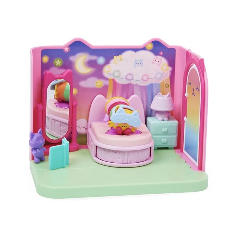 Ετοιμάσου για μια χουχουλιάρικη βραδιά με τη Γατιλάρη, στο Ονειρεμένο Υπνοδωμάτιο της Γατιλάρης από το Κουκλόσπιτο της Γκάμπι! Αυτό το δωμάτιο από το Κουκλόσπιτο της Γκάμπι είναι γεμάτο με διασκεδαστικές λεπτομέρειες και εκπλήξεις που μπορείς να εξερευνήσεις, ζωντανεύοντας το μαγευτικό δωμάτιο της σειράς. Άνοιξε τη συσκευασία για να βρεις μια συλλεκτική φιγούρα Γατιλάρη, τρία έπιπλα υπνοδωματίου, ένα γατοκουκλάκι και δύο γατίσια γατοκουτιά με δύο επιπλέον αξεσουάρ-έκπληξη. Άνοιξε τα γατίσια γατοκουτιά σου ακριβώς όπως κάνει η Γκάμπι στην αρχή κάθε επεισοδίου και ανακάλυψε τα αξεσουάρ-έκπληξη: ένα βιβλίο που ανοίγει και μια μάσκα ύπνου για τη Γατιλάρη! Φόρεσε τη μάσκα στο κεφάλι της, κάνε ότι σβήνεις το γατοπορτατίφ στο κομοδίνο και βάλε τη Γατιλάρη και το γατοκουκλάκι της για ύπνο. Πίεσε το κρεβάτι προς τα κάτω και το ράφι με τα βιβλία μεταμορφώνεται σε ονειρεμένο ουρανό με πολύχρωμα γατοκουνελάκια! Είναι τόσο διασκεδαστικό! Δες τον καθρέφτη: στριφογυρίζει πάνω-κάτω. Με τόσες δυνατότητες, το Ονειρεμένο Υπνοδωμάτιο της Γατιλάρης ενθαρρύνει τα παιχνίδια μίμησης και είναι τέλειο δώρο για παιδιά. Συνδύασέ το με την Κουζίνα και το Κεκάκι και το Λουτρό Ομορφιάς της Γοργονάτας, για να δημιουργήσεις τον δικό σου γαταστικό κόσμο. Προσάρμοσε το δωμάτιο στο Κουκλόσπιτο της Γκάμπι για ακόμα πιο γατοδιασκεδαστικές περιπέτειες. Και μια τελευταία έκπληξη: σκάναρε τον κωδικό QR που κρύβεται μέσα στο γατίσιο γατοκουτί και βρες το μοναδικό δώρο σου στην εφαρμογή Gabby’s Dollhouse (διαθέσιμη για iOS και Android). Απόλαυσε μια βραδιά στο σπίτι με τη Γατιλάρη, στο Ονειρεμένο Υπνοδωμάτιο του Κουκλόσπιτου της Γκάμπι!