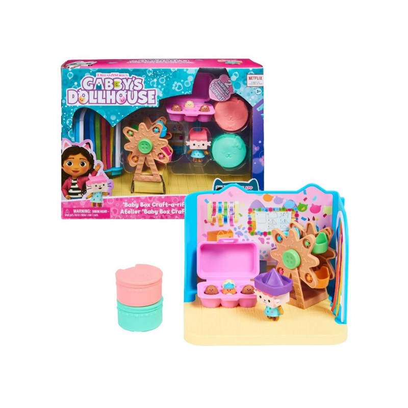 Ετοιμάσου για γαταστικές περιπέτειες γεμάτες παιχνίδι στο γαταπίθανο Δωμάτιο Δημιουργίας με το Μωρό Κουτάκι! Αυτό το δωμάτιο από το Κουκλόσπιτο της Γκάμπι είναι γεμάτο με διασκεδαστικές και εντυπωσιακές λεπτομέρειες που μπορείς να εξερευνήσεις, ζωντανεύοντας το μαγευτικό δωμάτιο της σειράς. Περιλαμβάνει μία συλλεκτική φιγούρα Μωρό Κουτάκι, με τα κατοικίδια χοροπηδηχτά γατοχάμστερ του στη μικρή θήκη αβγών, μια ρόδα λούνα παρκ που γυρίζει πραγματικά, μια πόρτα προς το υπνοδωμάτιο με πραγματική πολύχρωμη κουρτίνα-κρόσσια και δύο δέματα από το Κουκλόσπιτο με παιχνίδια-έκπληξη! Άνοιξε τα δέματα από το Κουκλόσπιτο και ανακάλυψε τα αξεσουάρ-έκπληξη: μια μικρή βαρκούλα και ένα κουκλάκι γατοχάμστερ για να παίζει με το Μωρό Κουτάκι και να ανέβει στη ρόδα. Για ακόμα περισσότερη διασκέδαση, τοποθέτησε το γαταστικό Δωμάτιο Δημιουργίας δίπλα στο Λουτρό Ομορφιάς της Γοργονάτας και το Ονειρεμένο Υπνοδωμάτιο της Γατιλάρης προσαρμόζοντάς τα στο Κουκλόσπιτο της Γκάμπι, για να δημιουργήσεις τον δικό σου γαταστικό κόσμο! Και μια τελευταία έκπληξη: σκάναρε τον κωδικό QR που κρύβεται μέσα στο γατίσιο γατοκουτί και βρες το μοναδικό δώρο σου στην εφαρμογή Gabby’s Dollhouse (διαθέσιμη για iOS και Android). Τα κουκλάκια, τα λούτρινα, οι φιγούρες και τα σετ με θέμα το Κουκλόσπιτο της Γκάμπι είναι εκπαιδευτικά παιχνίδια και ιδανικό δώρο για παιδιά. Αναπτύσσουν τη φαντασία των παιδιών μέσα από διασκεδαστικά και δημιουργικά παιχνίδια μίμησης.