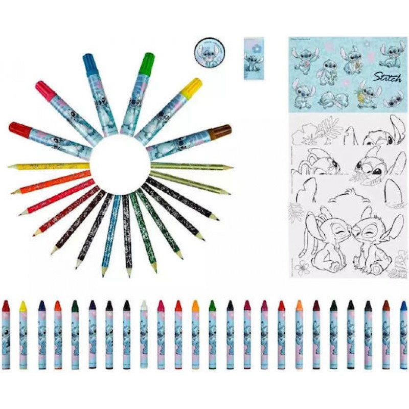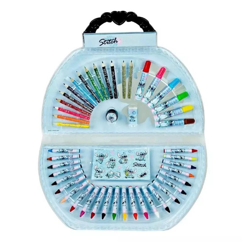 Βαλιτσάκι ζωγραφικής Gim Lilo και Stitch 51τμχ (342-02770). Με το Βαλιτσάκι Ζωγραφικής Stitch τα παιδιά θα διασκεδάσουν και θα δημιουργήσουν τις πιο φανταστικές ζωγραφίες αγαπημένων παιδικών ηρώων. Βαλίτσα σε σχήμα μισού φεγγαριού γεμάτη με 51 κομμάτια χρωμάτων και προμήθειες ζωγραφικής. Η Undercover θήκη χρωματισμού περιλαμβάνει 12 μίνι χρωματιστά μολύβια, 6 μαρκαδόρους, 24 χρωματιστά κραγιον, γόμες, 2 μίνι μολύβια, ξύστρες και 4 αφίσες.